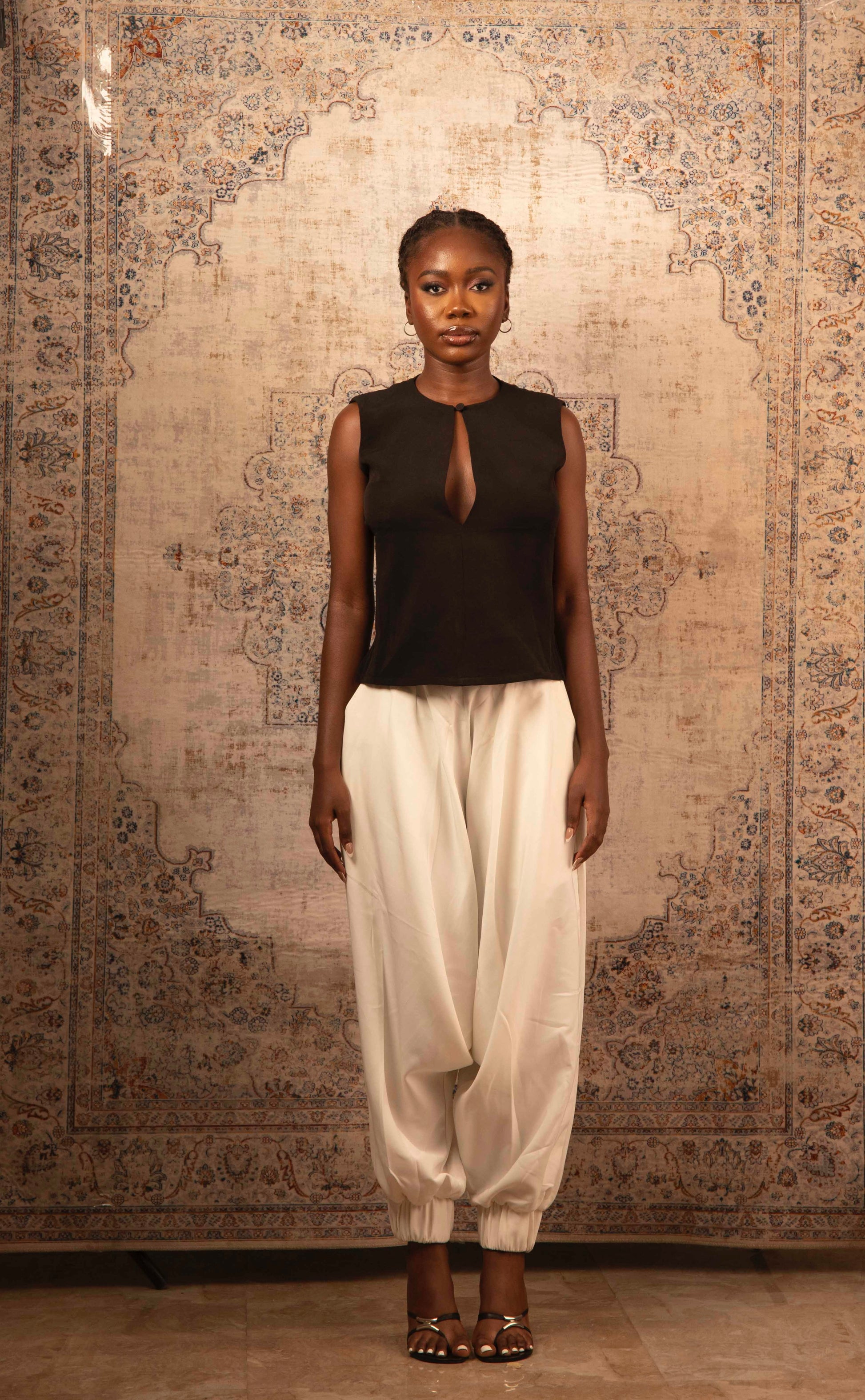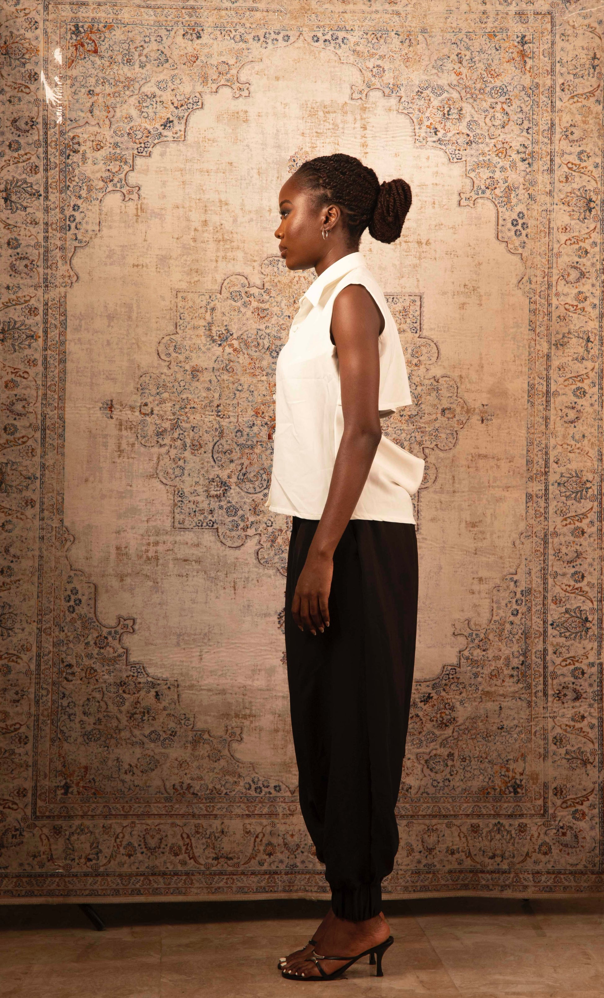 The Zouave Pants redefine ease with a high-waisted yoke and sculptural volume that tapers into softly elasticated cuffs. Designed to sit comfortably on the waist, they flow effortlessly while offering practical side pockets for everyday functionality. Available in lightweight crepe (White, Black) and an elevated denim variation, these pants are a modern staple for laid-back elegance.